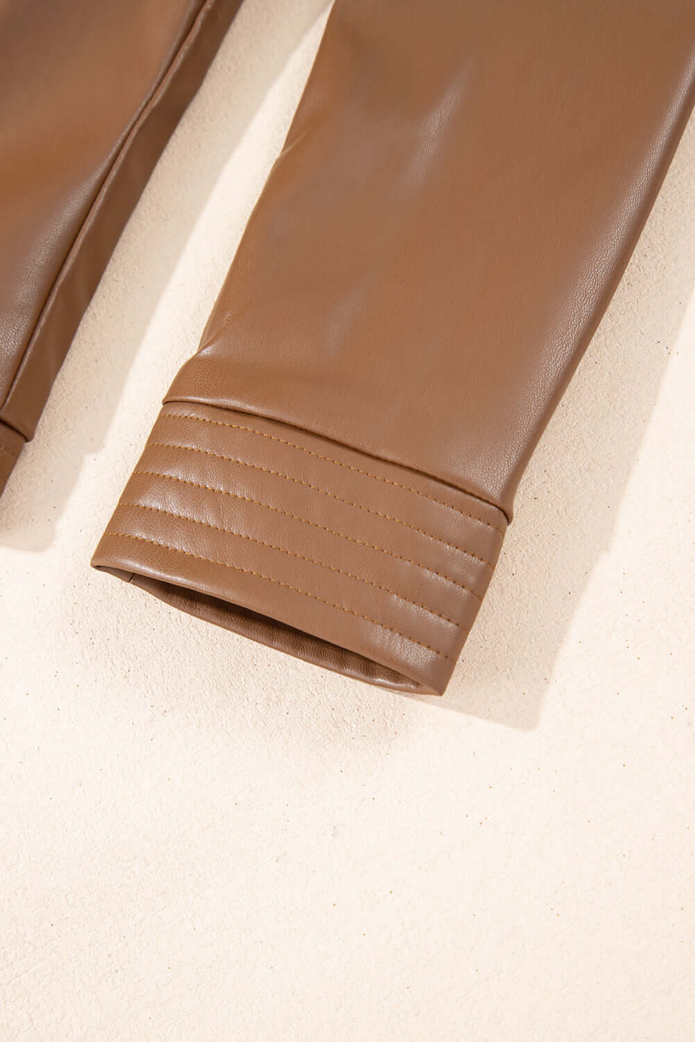 Crafted from premium faux leather, it offers a luxe feel while being eco-friendly. The trendy zipper details provide a contemporary edge, while the slim fit design enhances your silhouette. Available in a variety of sizes, this jacket guarantees the perfect fit.